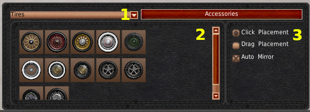 タイヤやボディパーツを車両に配置するには、デザイナーメニューから「タイヤとボディパーツ」ボタンをクリックする必要があります。このボタンをクリックすると 「アクセサリー」パネルが表示されます。