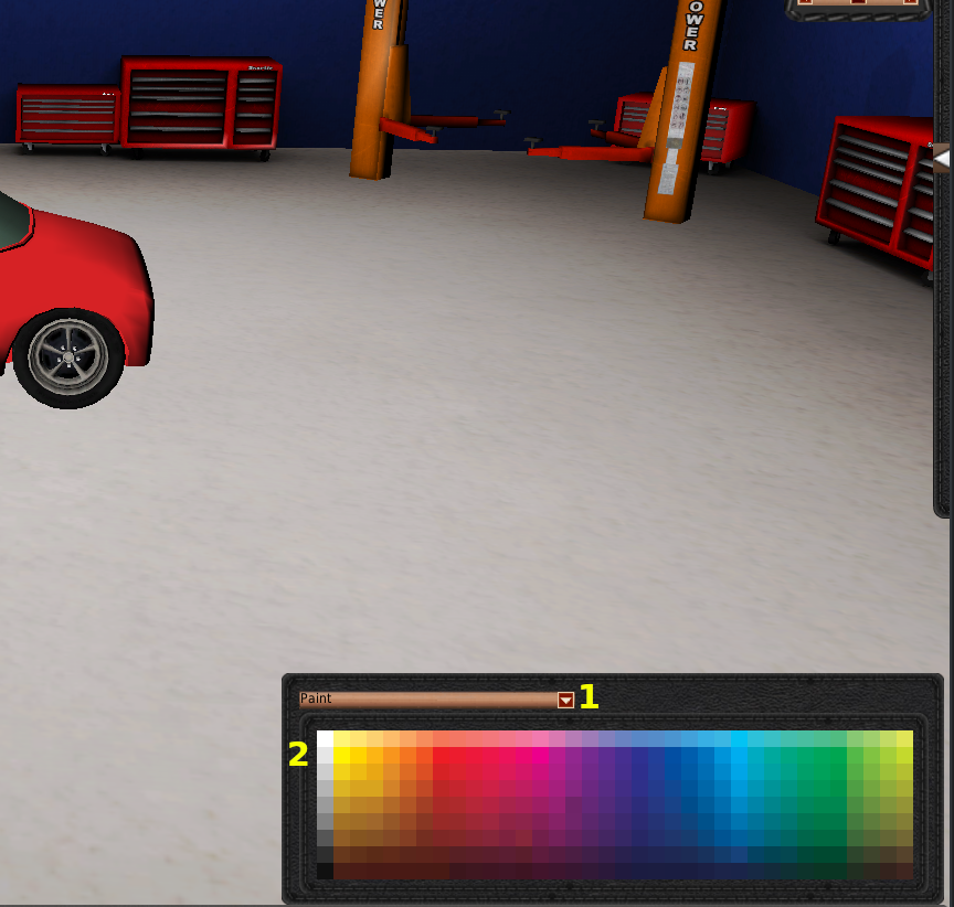 ペイントシステムでは、車両デザインの様々な部分をペイントすることができます。画面の右下にペイントメニューが表示されます。上部には、ペイントの種類を選択するドロップダウン(#1)があります。このドロップダウンでは、「ペイント」「金属」「ガラス」「素材」を選択することができます。車両の一部は、特定のカテゴリーの塗料でしか塗装できません。例えば、車両のガラスを変更するには、ドロップダウンで「ガラス」カテゴリーが選択されている必要があります。