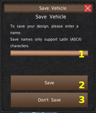 「完成」ボタンをクリックすると、ゲームは「アドバンスドデザイナー」または「アシスタントデザイナー」に戻ります。また、「車両を保存」というポップアップウィンドウが表示されます。このウィンドウは、車両のボディデザインを保存して、後で「車両を読み込む」ボタンを使って再度使用する場合に備えます。デザインを使用しない場合は、この作業を行う必要はありません。*このウィンドウではデザインの保存は行いません。車体デザインを保存するのではなく、次回以降のゲームで再び車体デザインを読み込むためのものです。*