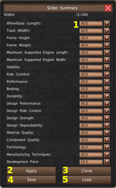 また、このウィンドウでは、保存ボタン(#4)を使ってスライダーを外部のハードディスクに保存することもできます。スライダーをディスクから読み込むには、読み込みボタン(#4)をクリックします。これらのファイルの場所については、ファイルの場所のページを参照してください。本ゲームでは改造が可能なため、スライダーのファイルにはサブコンポーネントの選択が保存されていません。ボアやストロークなどの一部のスライダーは、サブコンポーネントの値に依存します。