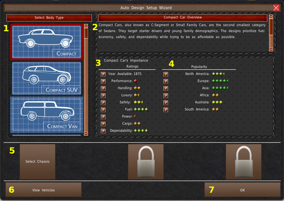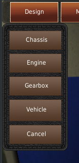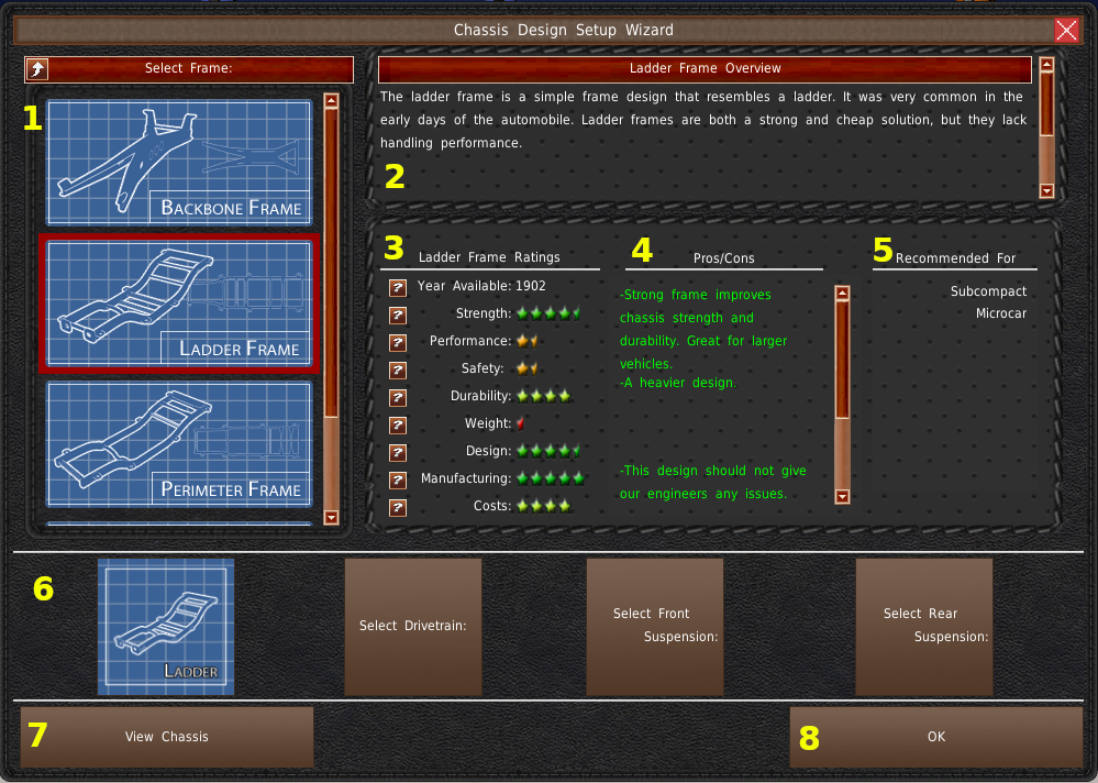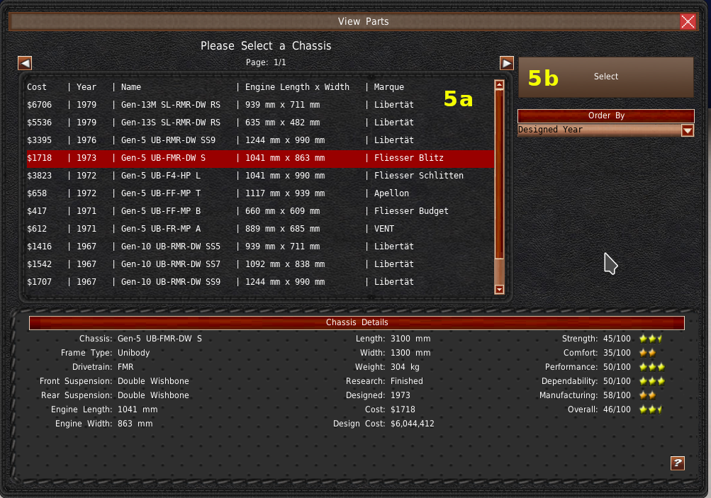 下部には3つの茶色いボタン(#5)があります。これがコンポーネント選択ボタンです。シャーシから順番に選んでいく必要があります。ボタンにロックが付いている場合は、前のコンポーネントを先に選択する必要があることを意味します。選択ウィンドウでは、リストからコンポーネントをクリックしなければなりません(#5a)。そして、「選択」ボタンをクリックします(#5b)。もし、何もコンポーネントがリストアップされていない場合は、それらが設計を終えていないか、選択された他のコンポーネントと一緒に動作しないかのどちらかです。例えば、エンジンの長さと幅は、シャーシがサポートする最大エンジンサイズよりも小さくなければなりません。