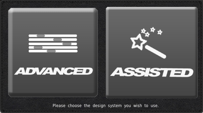 シャーシ、エンジン、ギアボックスのデザインを選択すると、画面中央に2つの大きなグレーのボタンが表示されます。アドバンスドデザイナーを使用するかどうかの選択がありますが、これにはスライダーを使った操作が必要になります。あるいは、スライダーの数を3つに減らしたアシストデザイナーを選択します。