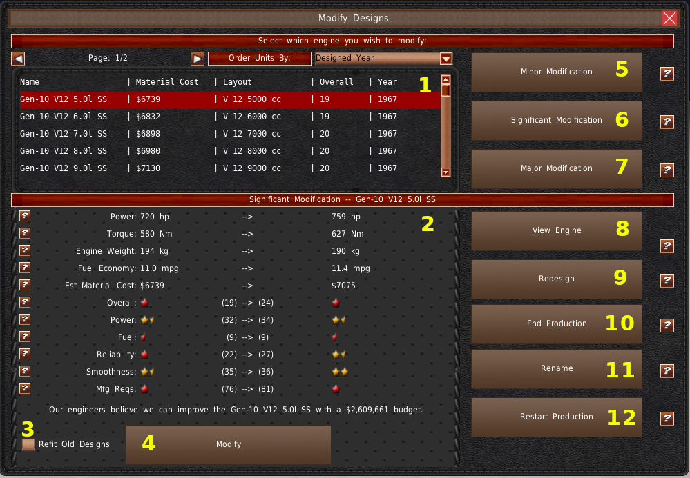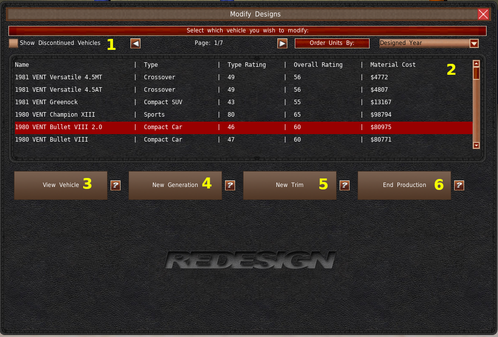左側には、このデザインを使用しているあなたの車両のうち、改装可能なものがリストアップされています(#1)。なお、1年に1台以上のフルモデルチェンジ車両を作ることはできません。そのため、3つの部品をすべて修正する場合は、まず1つの部品を修正し、次に別の部品を修正し、さらに3つ目の部品の修正を行うようにしてください。