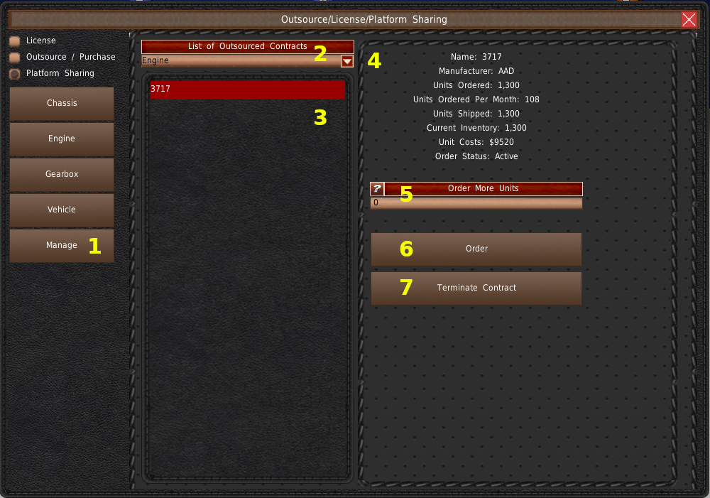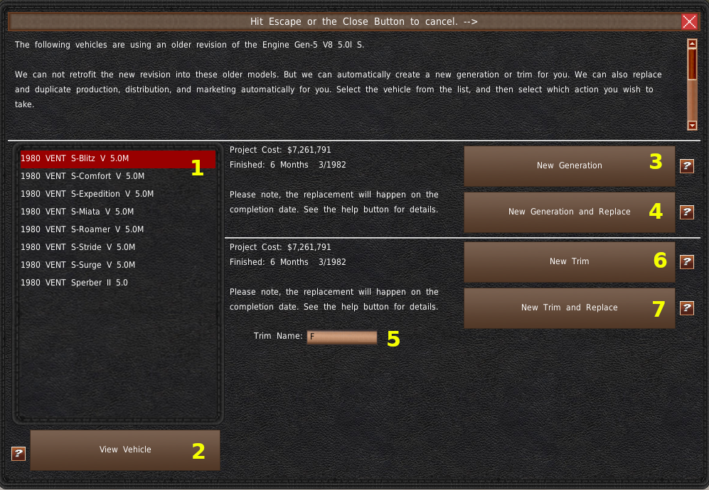 「生産終了」ボタン(#6)を押すと、この車両の生産が停止され、中止されます。在庫がある場合や外注契約が残っている場合、システムはこの車両を販売から外します。そうでなければ、この車両はバイヤーの支店で販売されたままとなります。このボタンを押すと、この車両デザインに関する契約がすべて終了します。違反しないように注意してください。