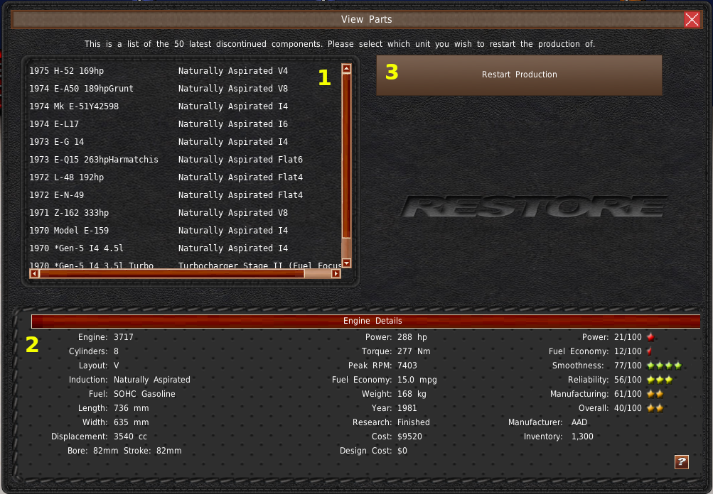 ウィンドウの一番上には、「生産中止車両を表示」チェックボックスがあります(#1)。このトグルを有効にすると、リスト(#2)に生産を終了した車両が表示されます。生産終了した車両をリストから選択すると、リストの下に「モデルの復活」ボタンが表示されます。このボタンを使って生産終了した車両の生産を再開することができます。その他、以下のボタンは、フルモデルチェンジ、グレードの作成、車両の生産終了のためのものです。