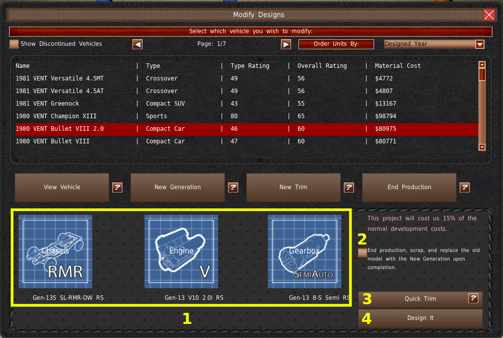 フルモデルチェンジまたは グレードボタンをクリックすると、ウィンドウの下部に新しいセクションが表示されます。左側のエリアには3つのボタンがあり、どのコンポーネントを変更するかを選択することができます(#1)。これらのコンポーネントのいずれかを変更すると、新しいモデルの設計にかかるコストと時間が増加します。シャーシは、時間やコストの節約を否定しますが、エンジンやギアボックスを変更する予定であれば、割引率はかなり高くなります。右側に開発費が表示されています(#2)。フルモデルチェンジを開発する場合、割引のすぐ下に「完成したら、生産を終了し廃棄、古いモデルの置き換えを行います。」というチェックボックスがあります(#2)。このチェックボックスにチェックを入れると、フルモデルチェンジが完成した時点でベースモデルの生産を終了し、在庫を廃棄して、販売から外すことができます。