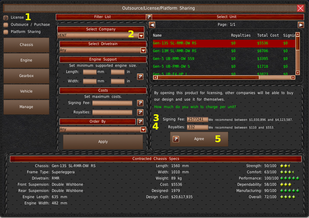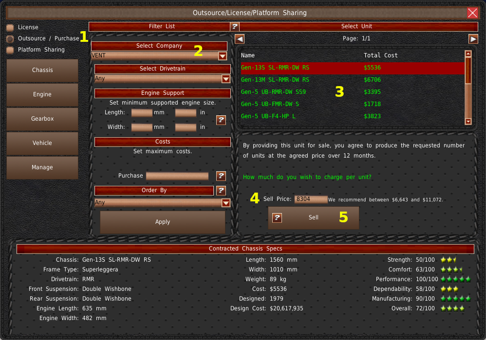 まず、右側のボタンから「管理」を選択します(#1)。次に、設計の種類(シャーシ、エンジン、ギアボックス、車両)をドロップダウンから選択します(#2)。このリスト(#3)には、有効な外注購入契約が入力されます。