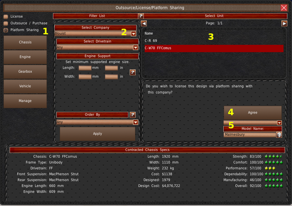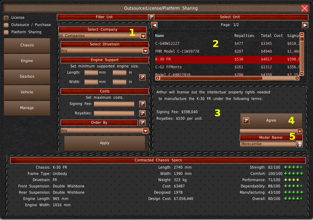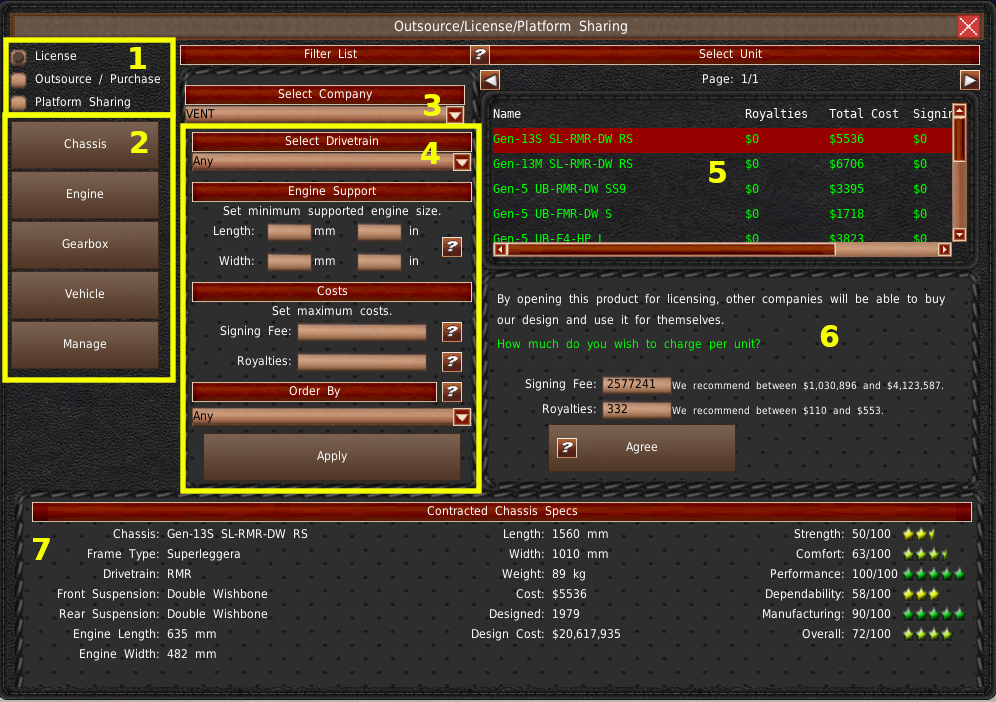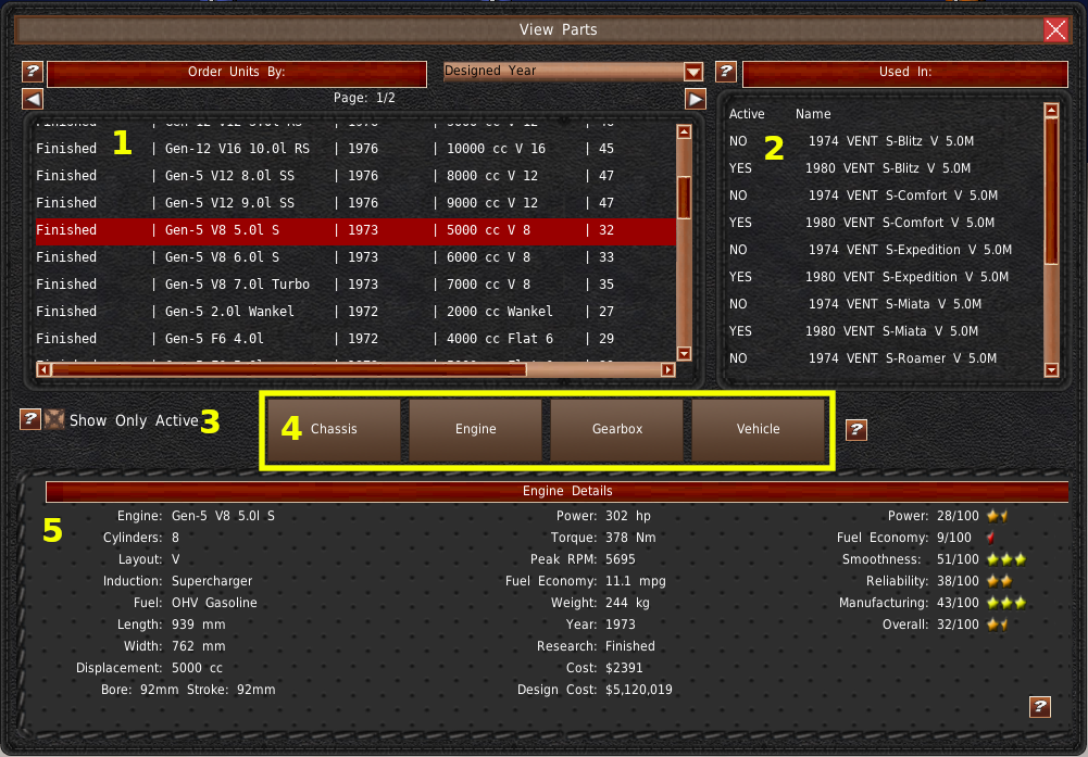 左上には、あなたのデザインの一覧が表示されます(#1)。このリストからデザインを選択すると、下のパネルにその車両に関する情報が入力されます(#5)。また、右上の2番目のリスト(#2)には、コンポーネントを表示している場合、選択したコンポーネントを使用している車両設計と契約が表示されます。また、車両を表示している場合は、選択したモデルをベースとした契約やバッジエンジニアリング車両が表示されます。