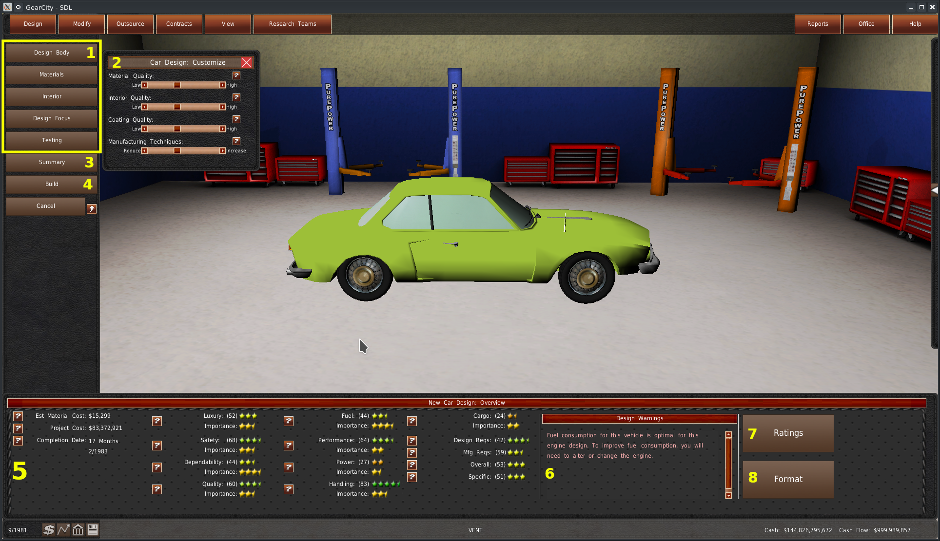 新しいウィンドウが表示され、プロトタイプのデザインが表示されます。このゲームでは、空力計算のためにあらかじめデザインされたボディが選択されています。車体の評価は左上に表示されます(#5)。右側にはスペックが表示されます(#6)。そして、左下には警告が表示されます(#7)。スライダーを調整しても、ゲームはプロトタイプのデザインを更新しません。デザインに変更を加えてプロトタイプを更新するには、更新ボタン(#8)をクリックしてください。