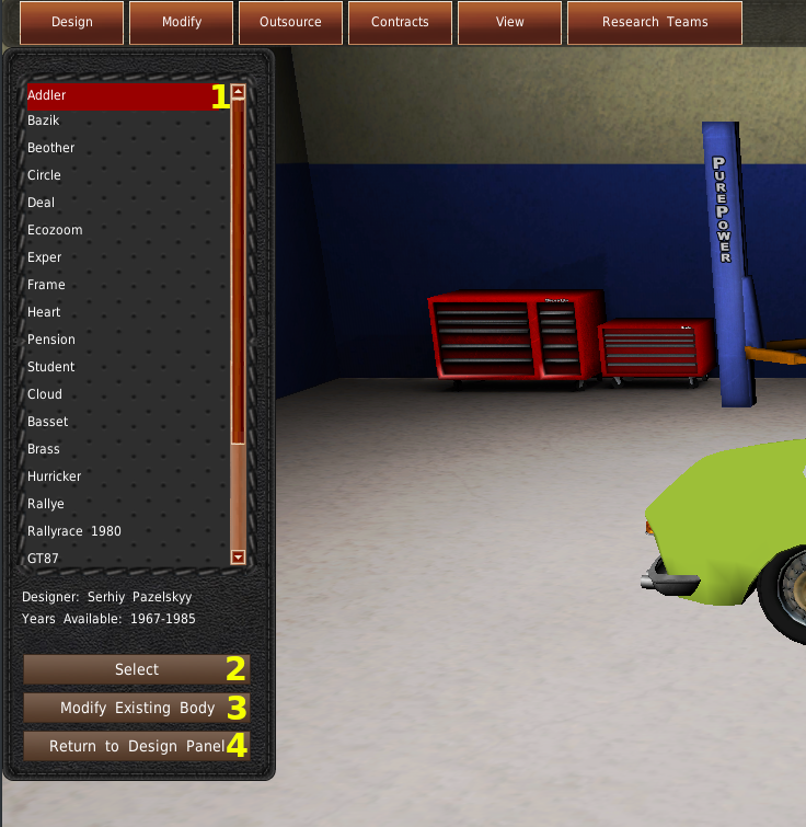 プレデザインをクリックすると、画面の左側に新しいパネルが表示されます。パネルの上部には名前のリスト(#1)が表示されています。これらは、選択された車種と年式のためにコミュニティによって作られた、あらかじめデザインされた車両です。リストの中から車両を選択すると、その車両がルームにロードされます。