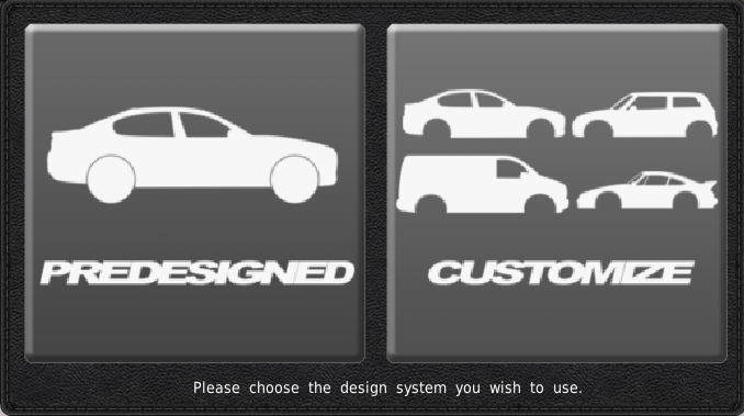 設定画面を終了すると、中央に2つの選択肢を持つポップアップが表示されます。このポップアップは、車体デザイナーの選択画面です。現時点では、プレデザインの車体を使用することをお勧めします。しかし、オリジナルの車体を作成したい場合は、このページの車体デザイナーで詳細を確認してください。また、車体のデザインのページにも詳しい説明があります。