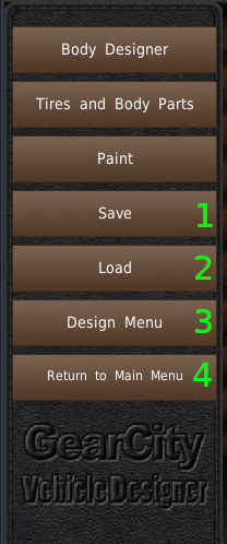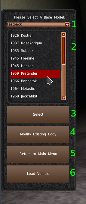 もし、このメニューでの作業が完了して、同じ車両の編集を続けたい場合は、リスト(#2)からベース車両ボディをクリックしないでください。その車両が読み込まれてしまい、作業内容が失われてしまいます。代わりに既存のボディを修正(#4)をクリックしてください。
