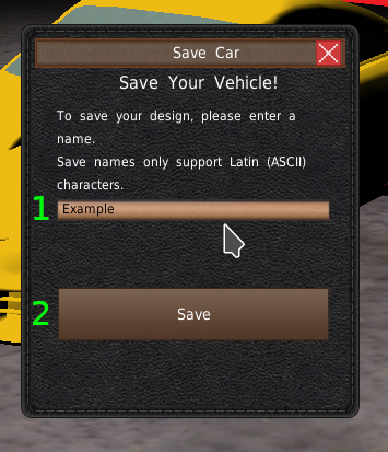 - 保存ボタンを押すと、保存ウィンドウが開きます。ボディデザインを今後も使用したい場合に使用します。このゲームでは、SavedCarsフォルダに.carファイルが保存されます。これらのファイルは、ゲーム内で車体をデザインする際や、スタンドアロンデザイナーで使用することができます。