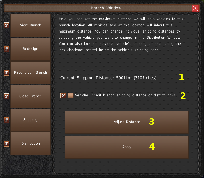 価格や距離の変更を保存するには、「適用」ボタン(#6)または「全てに適用」ボタン(#7)をクリックする必要があります。「全てに適用」ボタンをクリックすると、ゲーム内であなたがコントロールするすべての支店に変更が保存されます。
