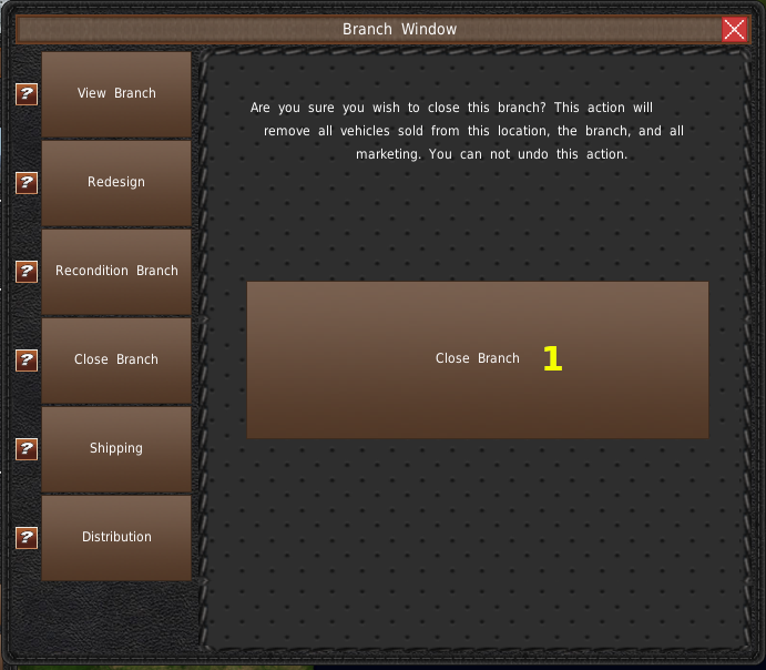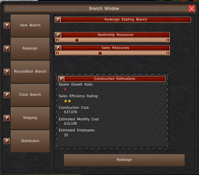 GearCityでは現在、1つの都市に1つの支店しか作れません。そのため、支店を改善したい場合は、支店を再設計する必要があります。再設計システムにアクセスするには、支店ウィンドウの左側から「再設計」ボタンをクリックします。再設計システムは、支店の建設システムと同じように動作します。詳しくは、再設計のセクションをご覧ください。