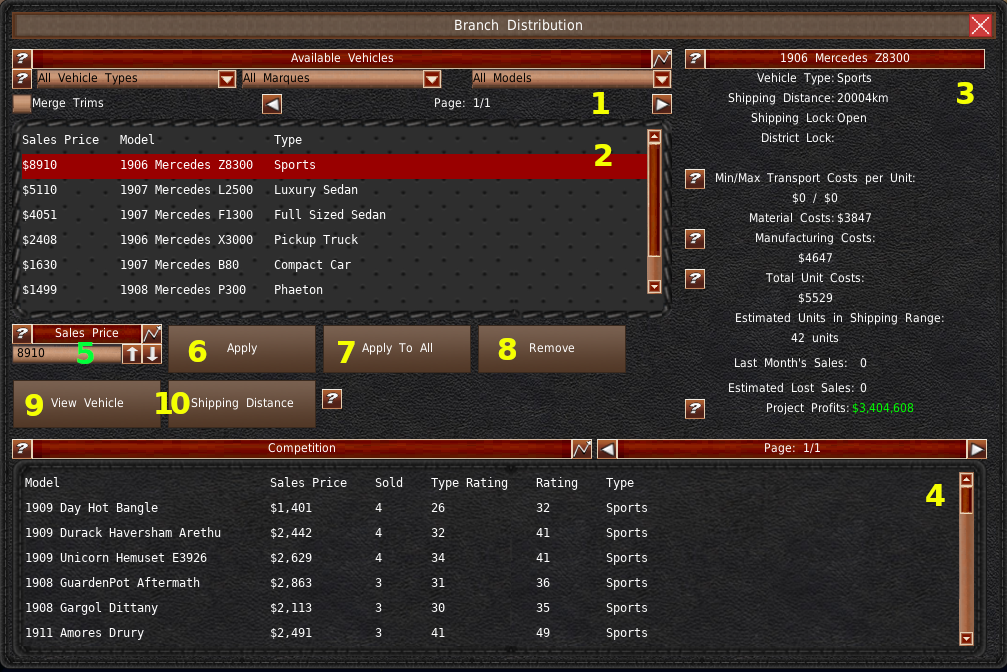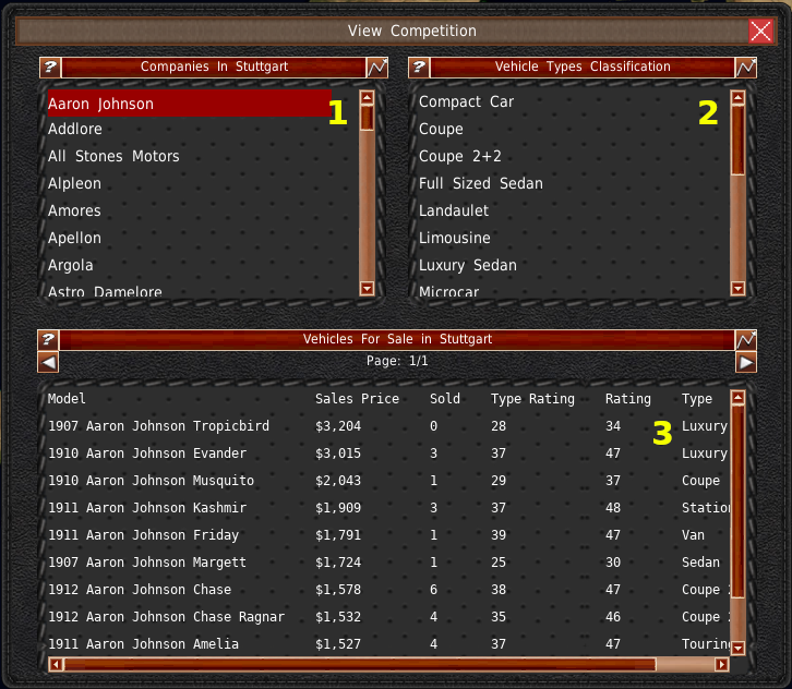 ウィンドウの下部には、競合リスト(#4)があります。これは、選択した車両と同じ車種で、選択した都市にあるすべての車種をリストアップしたものです。リストには、車名、販売価格、先月の販売台数、車種の重視する評価、総合評価、車種が表示されます。また、このゲームでは、自分の車両がわかりやすいように黄色でハイライト表示されます。