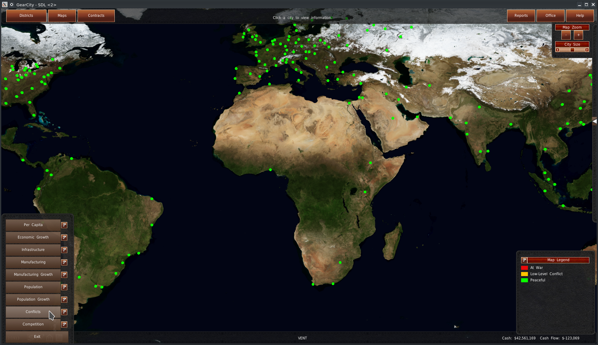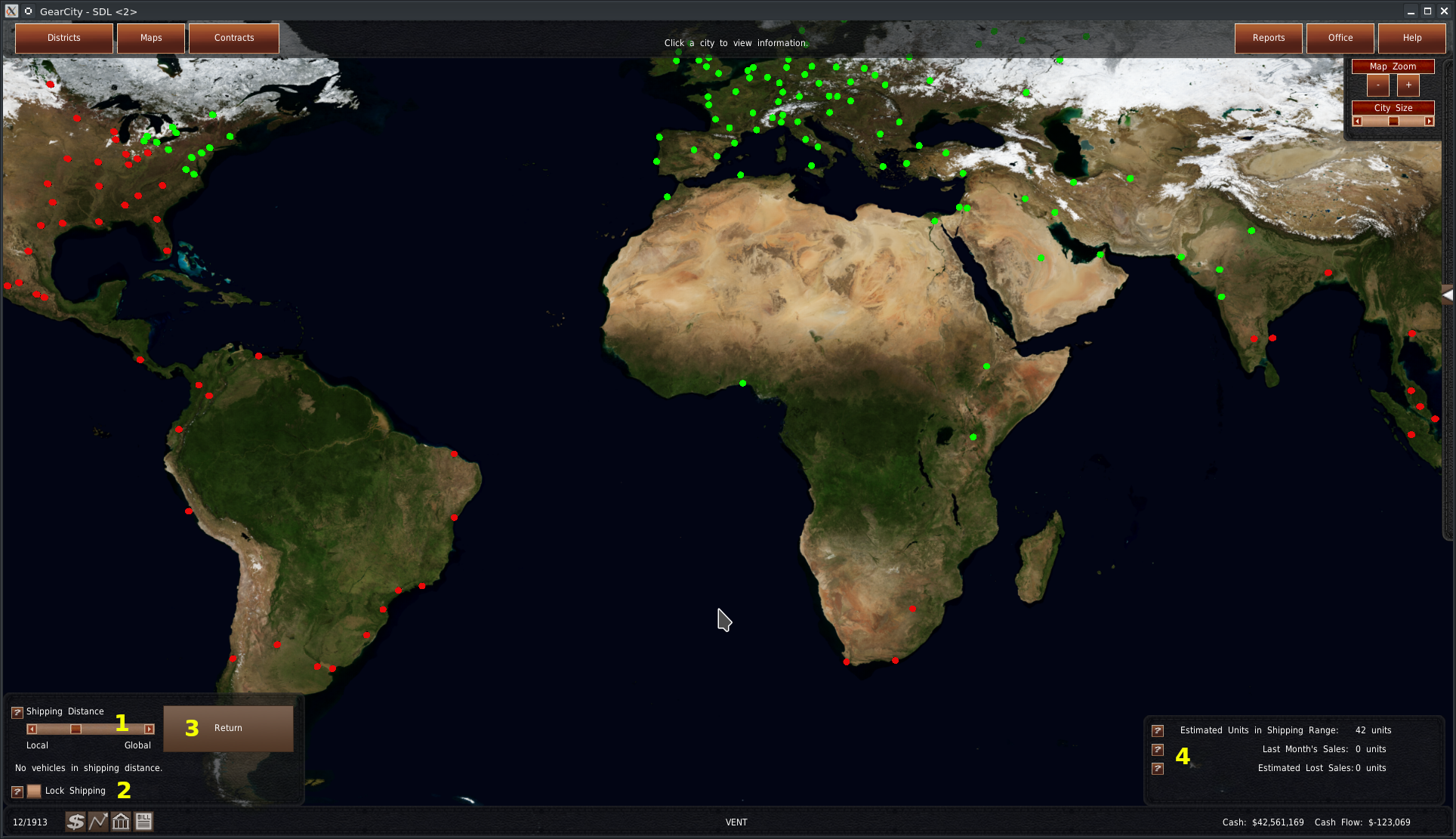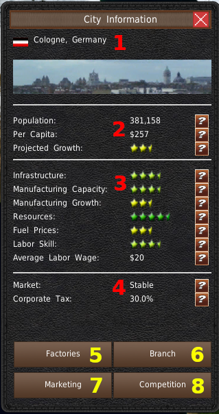 ウィンドウの一番下には、4つのボタンがあります。これらのボタンを使って、都市とやりとりすることになります。「工場」ボタン(#5)は、この都市の工場ツールを開くことができます。「支店」ボタン(#6)は、この都市の支店ツールを開きます。そして、「マーケティング」と「競合他社」ボタン(#7、#8)は、それぞれに対応するツールを開きます。