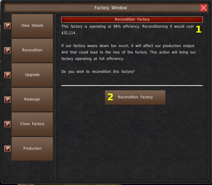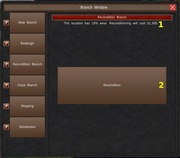 O時間が経つと、支店が損耗してしまいます。売り上げに影響が出始めると、アクションメモで知らせてくれます。また、自動修繕システムもあります。しかし、手動で修繕するように管理したい場合は、工場ウィンドウから修繕システムを使用することができます。修繕システムに行くには、支店ウィンドウの左側から「支店を修繕」ボタンをクリックします。パネルの上部には、修繕システムと現在の支店の損耗量(#1)が表示されます。修繕を行う場合は、「修繕」ボタン(#2)をクリックします。