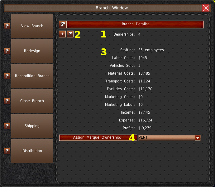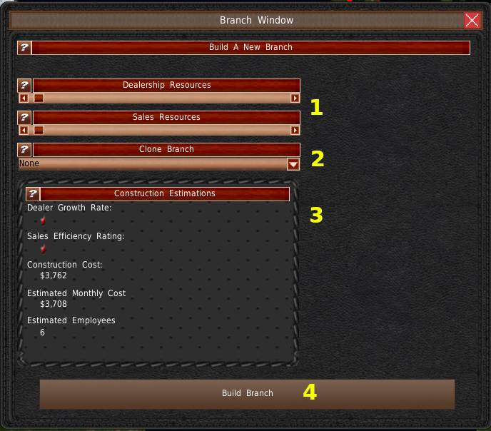 このウィンドウを使用して、この場所に支店を建設することができます。上の2つのスライダーを使用して、支店のリソースを設定します(#1)。ディーラーのリソースは、契約するディーラーの数を増加させるのに役立ちます。そして、販売リソースは、そのディーラーがより多くの車両を販売することを支援します。
