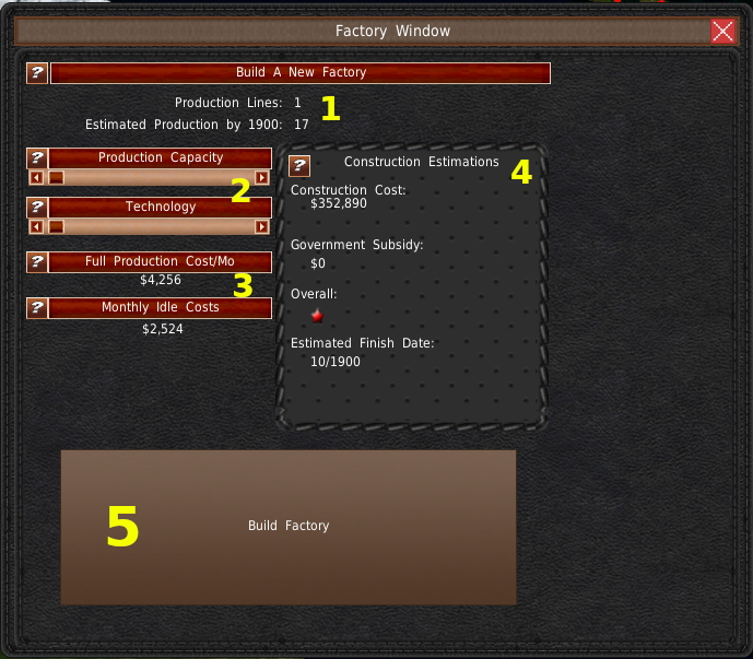 選択した都市に工場がない場合、「工場」ボタンをクリックすると、工場建設ウィンドウが表示されます。このウィンドウでは、この場所に工場を建設することができます。