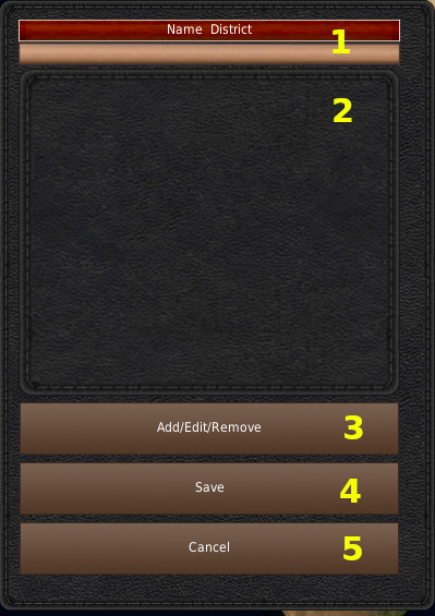 ウィンドウの上部には、地区の名前を入力します(#1)。地区を作成する場合は、名前を入力する必要があります。編集する場合は、あらかじめ名前が入力されているはずです。この名前を変更して「保存」を押すと、新しい地区が作成されます。