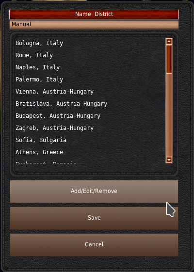 「地域の管理」ウィンドウで「作成」ボタンをクリックした場合、またはカスタム地区を編集した場合は、このウィンドウが表示されます。このウィンドウは、地区の都市リストです。新しい地区を作成する場合、空白になります(左の画像)。地区を編集している場合、または都市の選択が完了したばかりの場合は、右図のようなウィンドウが表示されます。