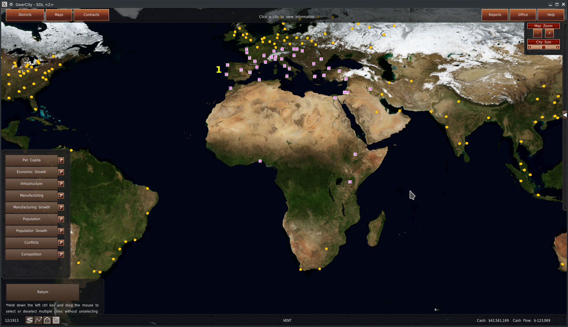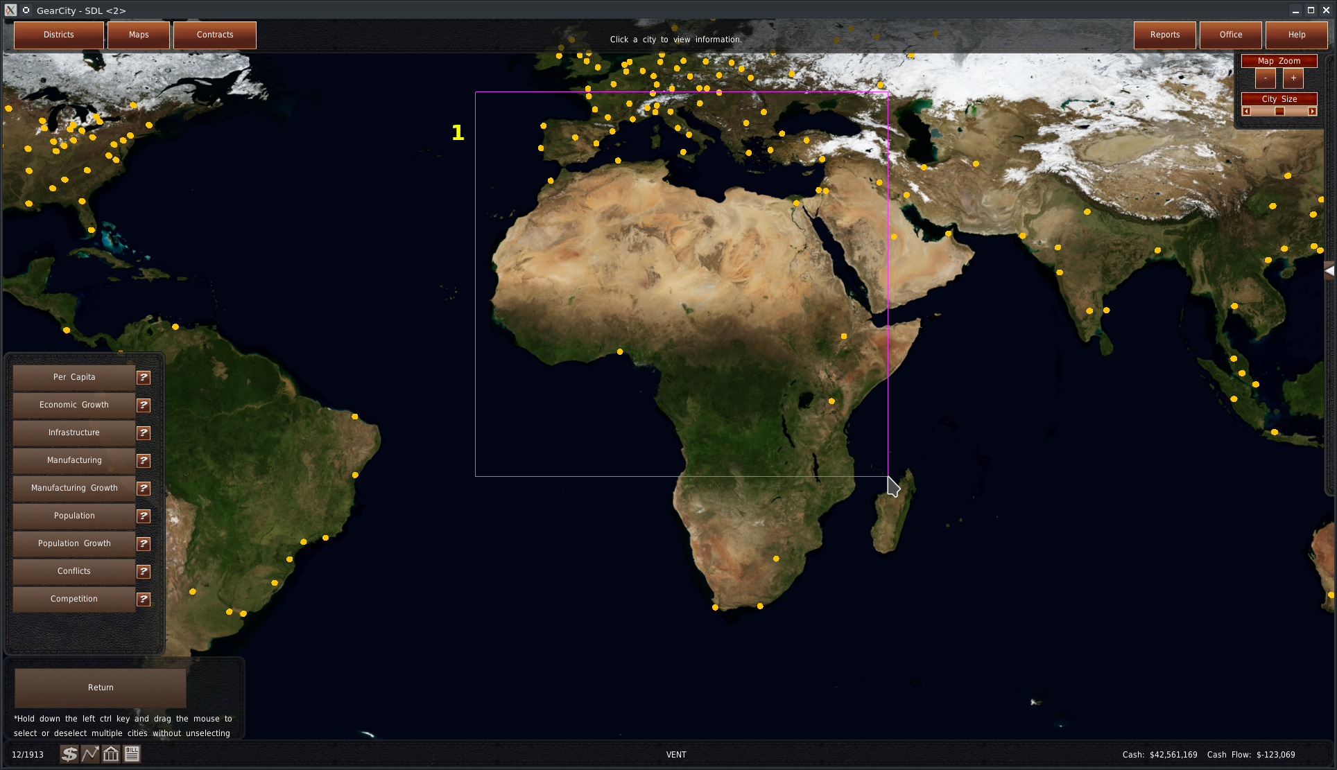 これは都市選択モードです。選択されている都市は、ピンク色で白い枠で囲まれています。マウスをクリックしてドラッグすると選択ボックスができ、一度に複数の都市を選択することができます(#1).