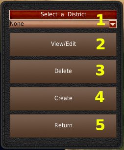 このウィンドウの上部には、既存のカスタム地区を示すドロップダウン(#1)があります。このドロップダウンから地区を選択すると、「表示/編集」と「削除」ボタン(#2、#3)を使用できるようになります。これらのボタンは、「なし」を選択した場合、無効になります。