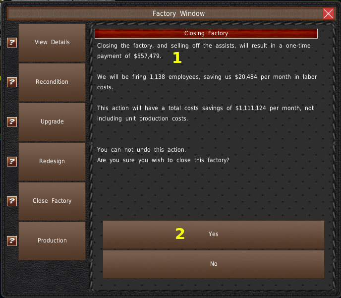 このパネルの一番上に、工場を売るとどれほどの利益になるかが表示されます(#1)。その下には、工場を閉鎖することで月々のコストがどれだけ削減できるかも表示されます。