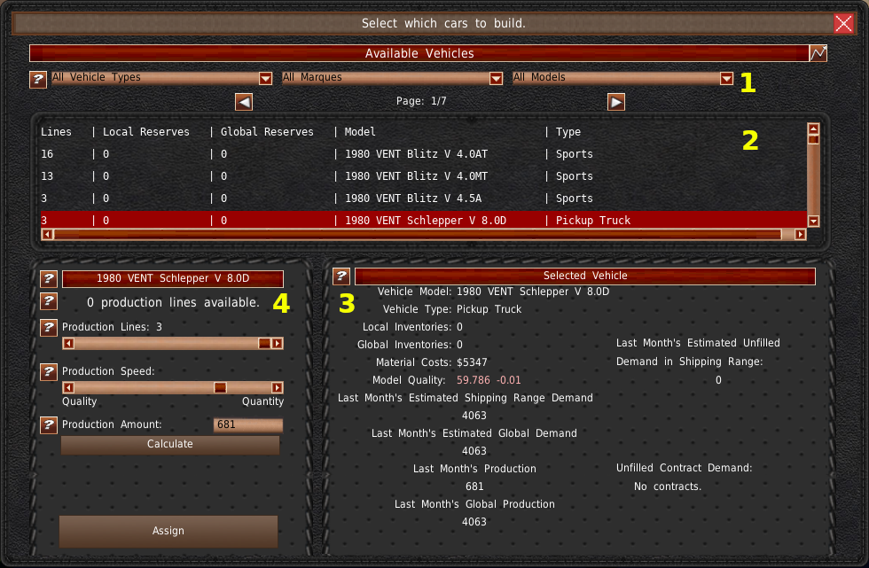 ウィンドウの上部には、車両リスト (#2) 用のフィルター (#1) があります。このリストには、この場所で使用されている生産ラインの数の順に、アクティブな車両設計がすべて表示されます。