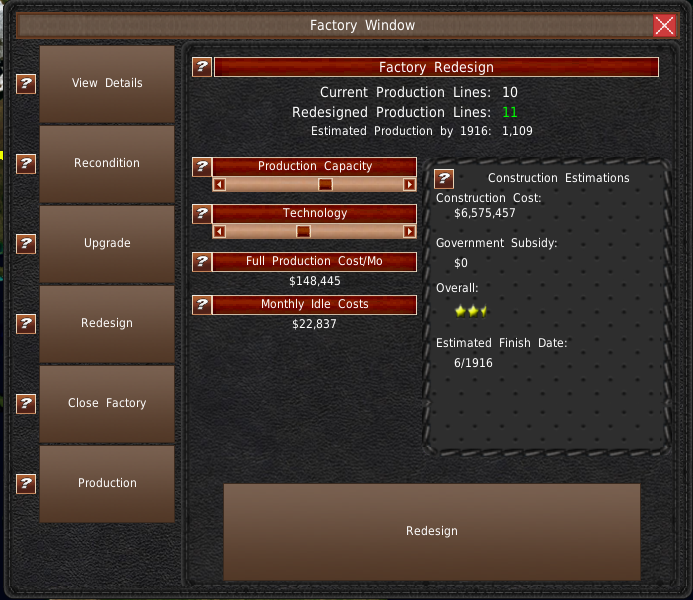 GearCityでは、現在、1つの場所に1つの工場しか設置できません。そのため、工場を大きく拡張したり縮小したりする場合は、再設計を行う必要があります。工場ウィンドウの左側にある「再設計」ボタンをクリックすると、再設計のためのシステムが起動します。