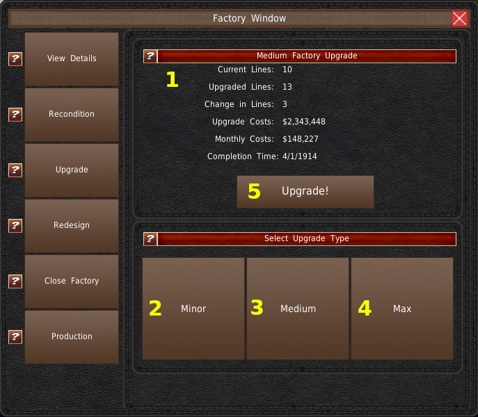 ゲーム内には3種類のアップグレードサイズがあります。一番下にある(#2,#3,#4)です。アップグレードのサイズが大きくなるほど、より高価で長い時間がかかります。下のボタンをクリックすると、上の情報(#1)が切りかわります。アップグレードの準備ができたら、「アップグレード!」ボタン(#5)をクリックします。なお、アップグレードは繰り返すほど指数関数的に高くなります。ある時点では、工場を再設計した方が安くつくでしょう。