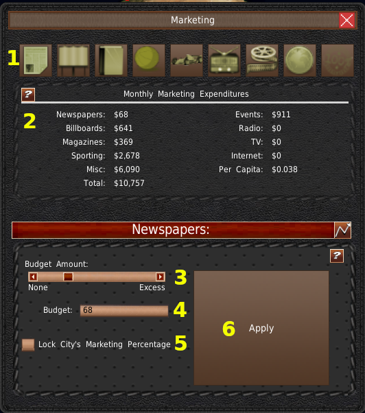マーケティングウィンドウの上部には、一連のボタンがあります(#1)。これらのボタンは、ゲーム内の各カテゴリーのマーケティングに対応しています。これらのボタンのいずれかをクリックすると、下部のパネルで選択されたマーケティングカテゴリが変更されます。もし全てのマーケティングカテゴリーを同時に変更したい場合は、オフィスメガメニューを使用してください。