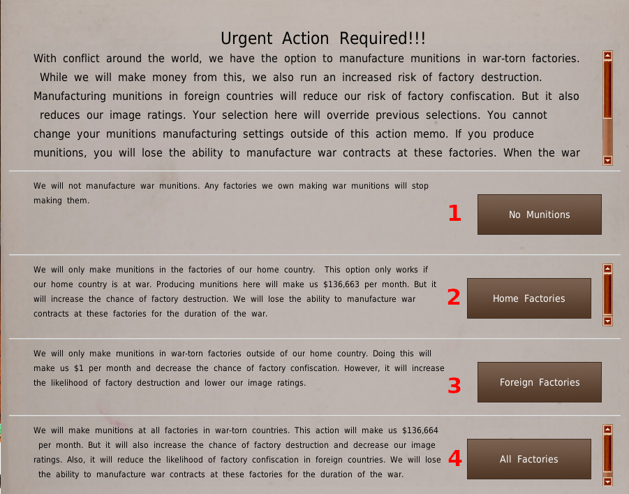 工場のある都市で戦争が始まると、軍需品に関するメモが表示されます。このメモには、4つのオプションがあります。そして、他の拠点が戦争に突入するまで、これらの選択を変更することはできません。ボタンの横のエリアには、アクションの説明がありますが、ここでも多少取り上げます。