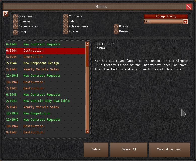 ゲーム内で戦争状態になると、外国企業との契約をすべて打ち切られます。また、入札者は、同じ国に本社を置く企業に限定されます。例えば、1940年にイギリスの会社を経営していた場合、その会社はドイツやフランスの軍用契約には応札できません。しかし、イギリスの軍用契約には応札できます。戦争中の国は、その国の規模や一人当たりの人口に基づいて、かなり多くの軍用契約を発生させます。