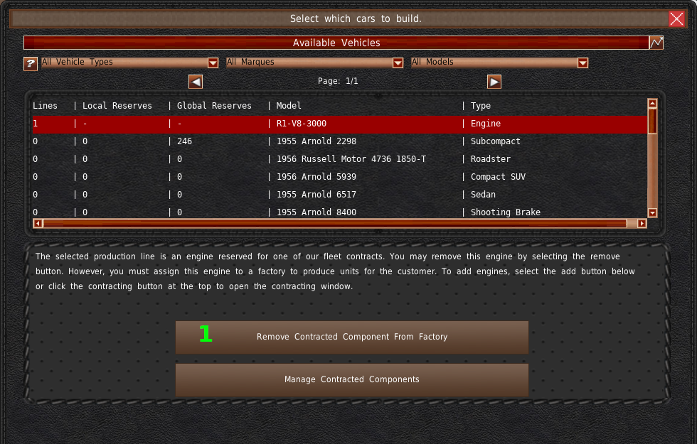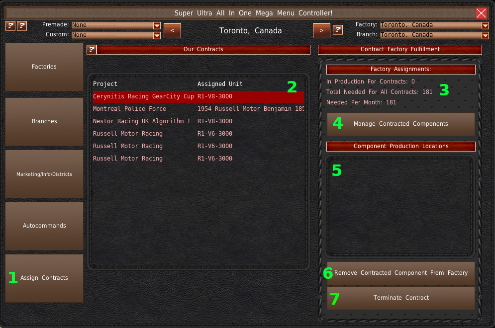 ワールドマップで、工場の生産ウィンドウからコンポーネントを選択することになります。ウィンドウの下に新しいパネルが表示され、「契約部品を工場から取り消す」ボタン(#1)が表示されます。それをクリックすると、工場からコンポーネントが削除されます。