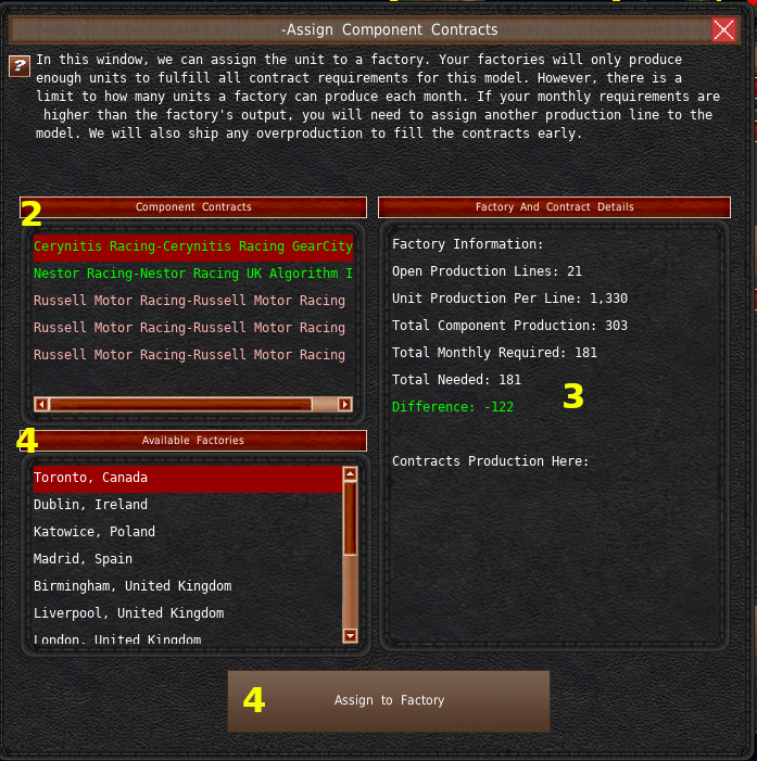 コンポーネントの契約を生産に割り当てるには、「契約部品の管理」ボタン(#4)をクリックします。このボタンはワールドマップ上では表示されません。ワールドマップ上であれば、リストからデザインを生産したい工場を選択し(#4)、「工場に割り当て」 ボタン(#4)をクリックすることになります。オフィスメガメニューでは、「契約部品の管理」ボタンをクリックすると、このリストとボタンが新しいウィンドウで表示されます。