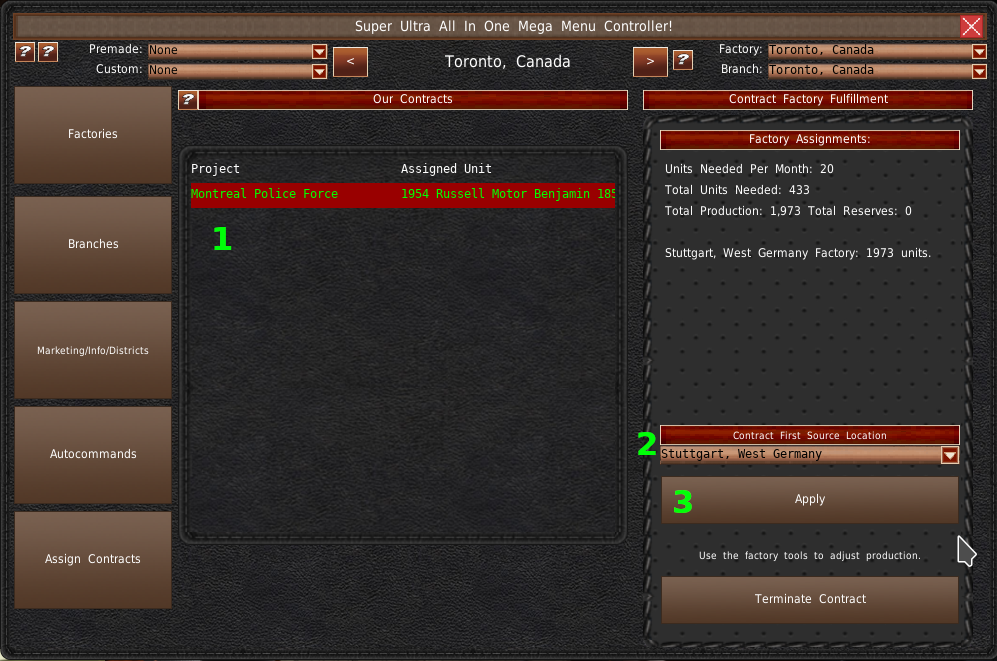 そのためには、契約の割り当てウィンドウを使用して、リストから車両契約を選択する必要があります(#1)。ウィンドウの右側にあるドロップダウン(#2)には、この車両を生産する工場が表示されます。契約からユニットを調達する工場をドロップダウンから選択します。工場を選択したら、「適用」ボタンをクリックします(#3)。