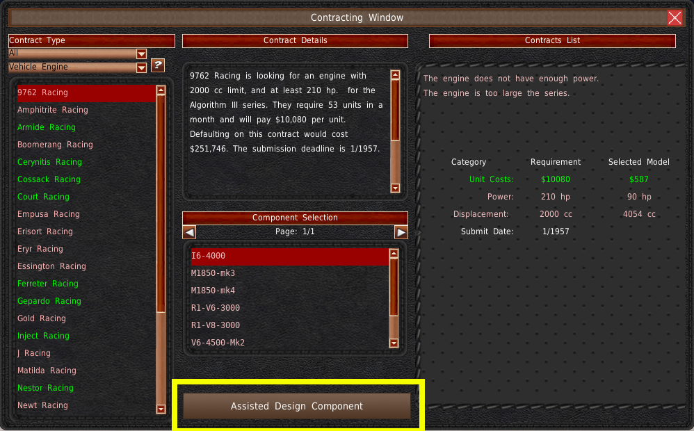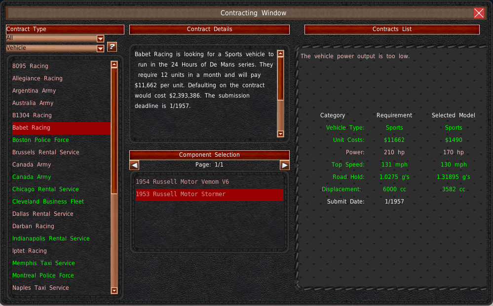 レーシング契約は、レースで使用される車種と、スペックレースで使用される部品に焦点を当てます。車両契約に関しては、車両の成功によって、ある程度の評価を得ることができます。しかし、エンジン、ギアボックス、シャーシの契約では、何も得ることはできません。レーシング契約では、通常、注文数は非常に少ないのですが、1台あたりの報酬は高くなります。