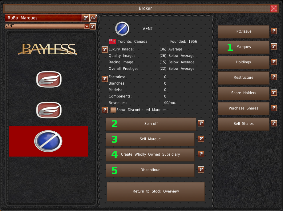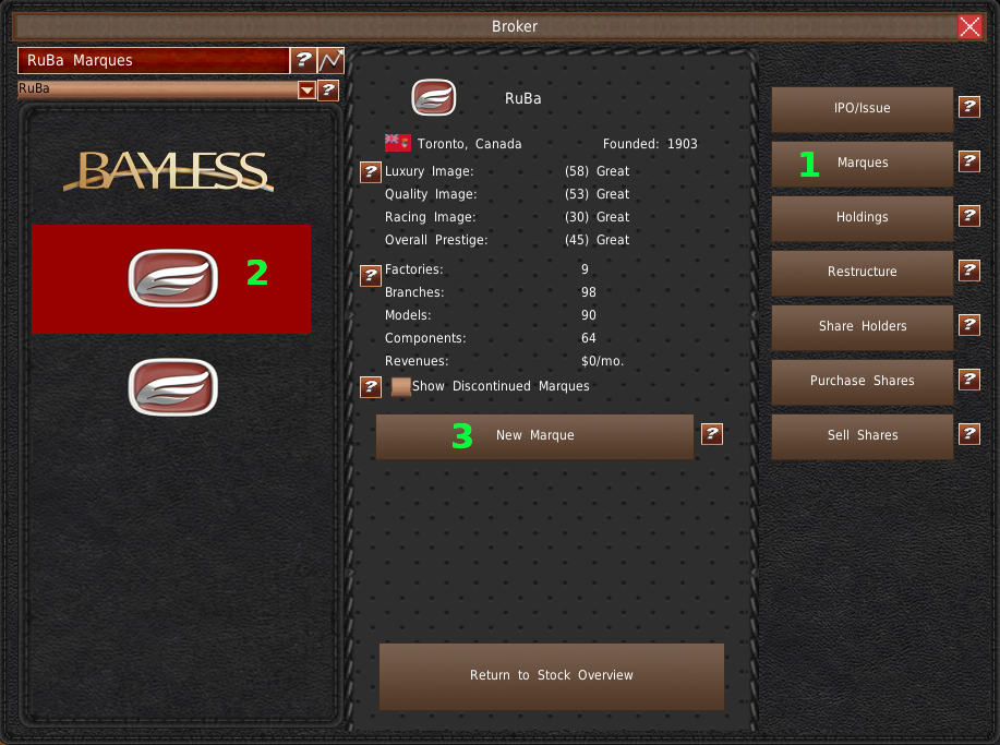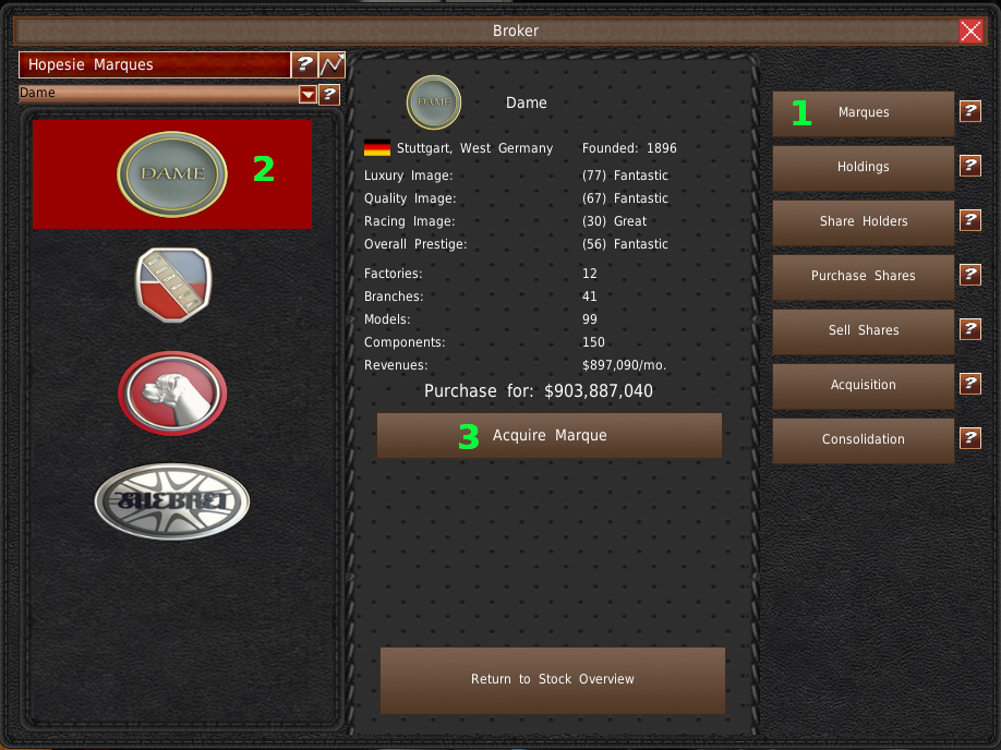 ある会社のブランドを購入したい場合、株式ブローカーウィンドウを開き、親会社を選択します。次に、「ブランド」ボタンをクリックします(#1)。すると、リストに親会社のブランドが表示されます(#2)。その中から好きなものを選んでください。中央のパネルに、価格とそのブランドに関する情報が表示されます。最後に、「ブランドの買収」ボタン(#3)をクリックすると、そのブランドを購入することができます。売りに出す気がない場合は、このボタンは表示されません。
