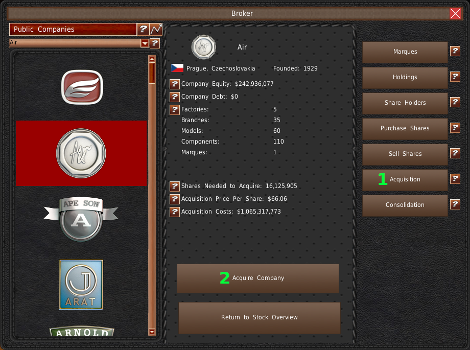 会社を買収するには、金融(金庫)の株式ブローカーウィンドウにアクセスする必要があります。次に、買収したい会社をリストから選択し、「買収」ボタン(#1)をクリックする必要があります。このボタンをクリックすると、買収パネルが表示され、その会社の情報や買収金額が表示されます。買収できる場合は、「会社の買収」ボタンをクリックします(#2)。