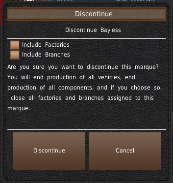 ブランドを廃止するには、リストからマークを選択し、「廃止する」ボタンをクリックします。新しいウィンドウが表示されます。このウィンドウでは、そのブランドが所有している工場や支店を破棄することもできます。これらのオプションに加えて、そのブランドを廃止すると、そのブランドのすべての車両とコンポーネントの生産が終了します。ブランドを廃止する準備ができたら、ウィンドウ内の 「廃止する」ボタンをクリックしてください。