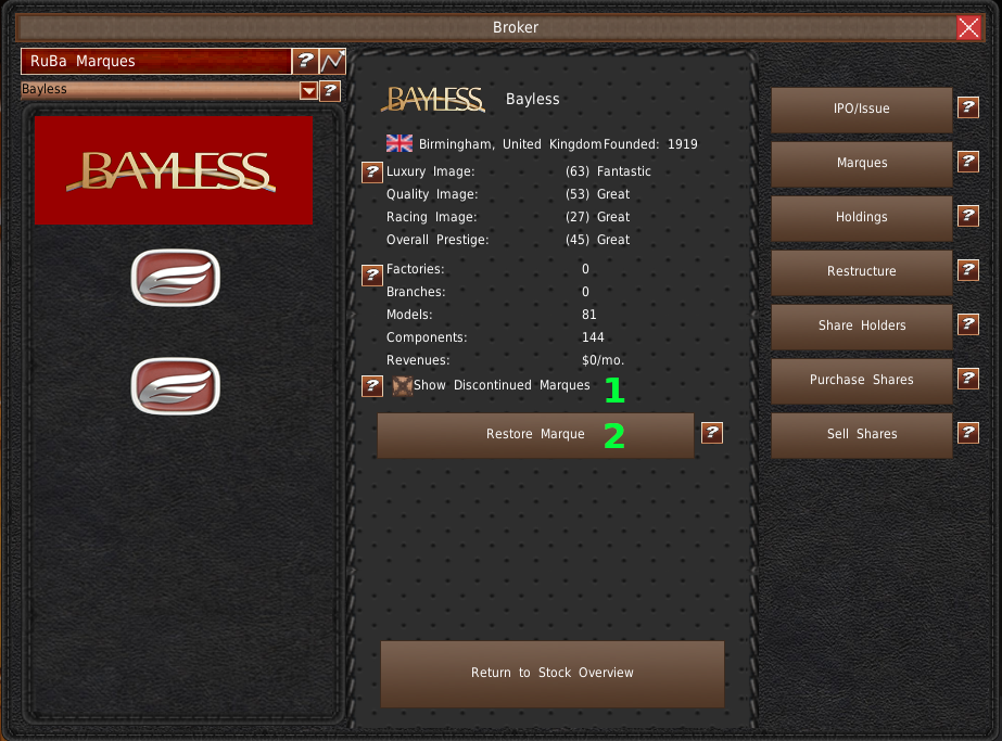ブランドを復元したい場合、それも可能です。株式ブローカーウィンドウのブランドパネルにある「廃止ブランドを表示」というチェックボックス(#1)をオンにします。このトグルを有効にすることで、ゲームはブランドリストに廃止されたブランドを表示するようになります。復元したいブランドを選択し、「ブランドを復活させる」ボタン(#2)をクリックします。このボタンが表示されていない場合、そのブランドは稼働中です。