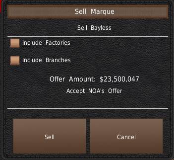 新しいウィンドウが表示されます。このウィンドウの上部には2つのチェックボックスがあり、ブランドが所有する工場や支店を売却対象に含めることができます。