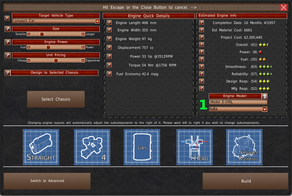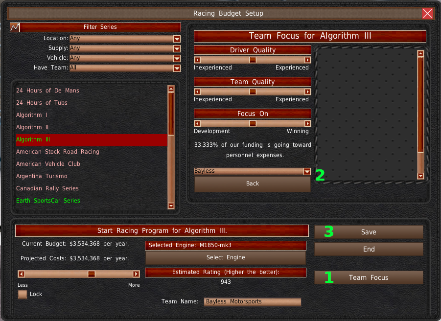 また、「フォーカス」ドロップダウンボックス(#3)を使用して、スピンオフの方針を調整することができます。この設定により、AI会社の動作変数をあらかじめ定義された値に変更することができます。行動変数は、彼らがどんな車両を作るか、車両を設計する際のスライダーの好みに影響します。この設定によって、会社を完全にコントロールしたり制限したりできるわけではありませんし、これらの変数が同じことをするわけでもありません。これは単に、会社がモデルを設計する方法に影響を与えるための方法です。