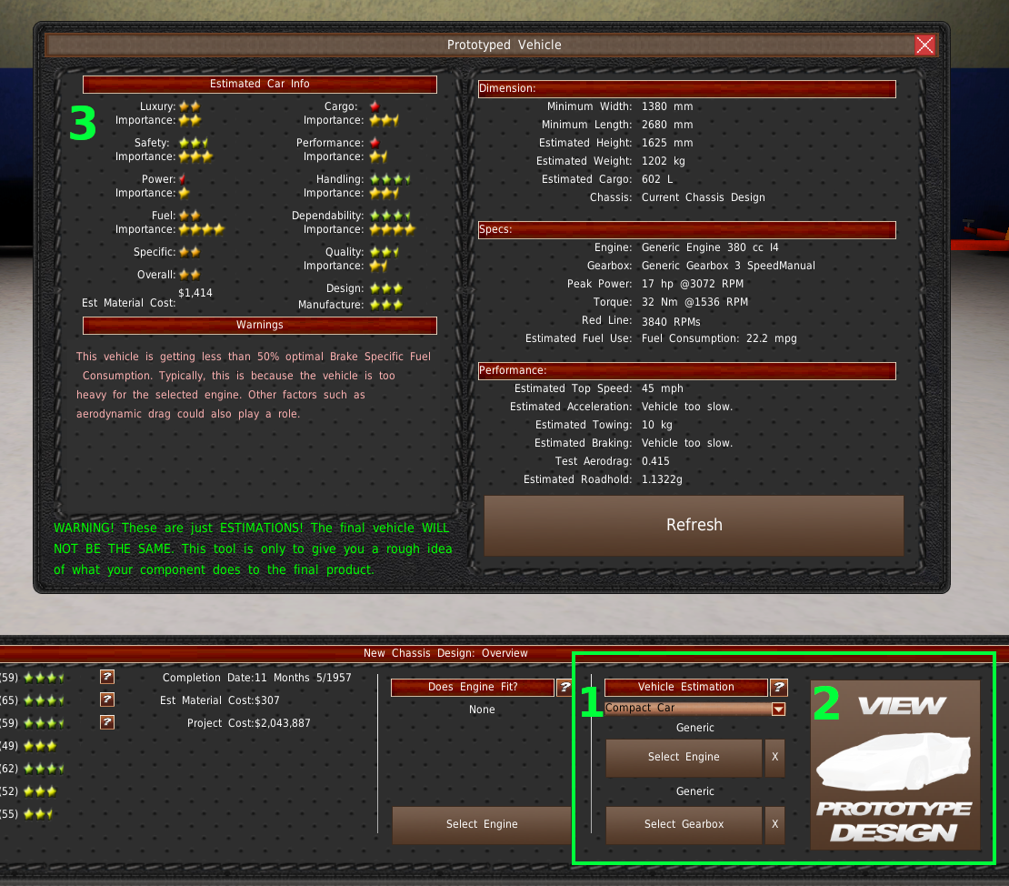 シャーシ、エンジン、ギアボックスのアドバンスドコンポーネントデザイナーを使用すると、Prototypingシステムを介して車種の重視する評価にアクセスすることができます。このシステムを使用するには、車両の見積もりのドロップダウン(#1)から車種を選択します。より正確な見積もりが必要な場合は、ドロップダウンの下にあるボタンで他のコンポーネントをペアリングすることができます。