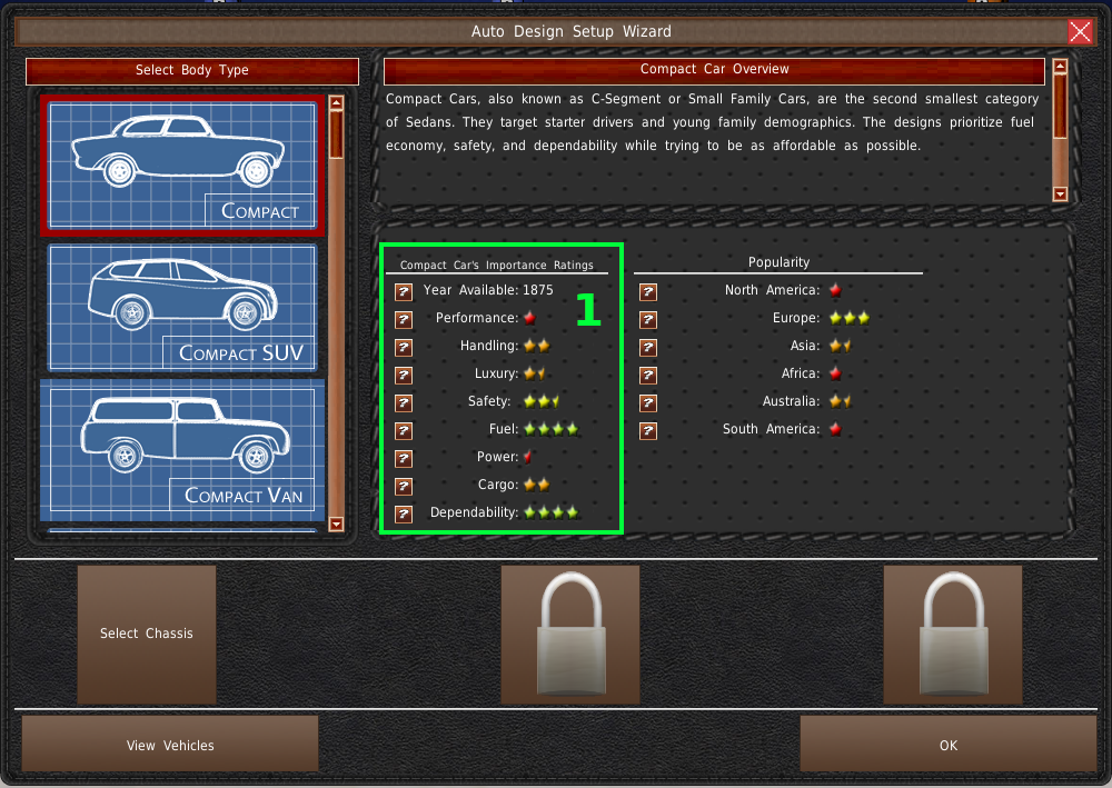 アドバンスド車両デザイナーでは、2つの場所で重視される評価が表示されます。1つ目は、セットアップウィザードの中です。リストから車両タイプを選択すると、ウィンドウの最初の詳細リスト(#1)に重視される評価が表示されます。コンポーネントを選択する際に、これらの評価を使用することになります。