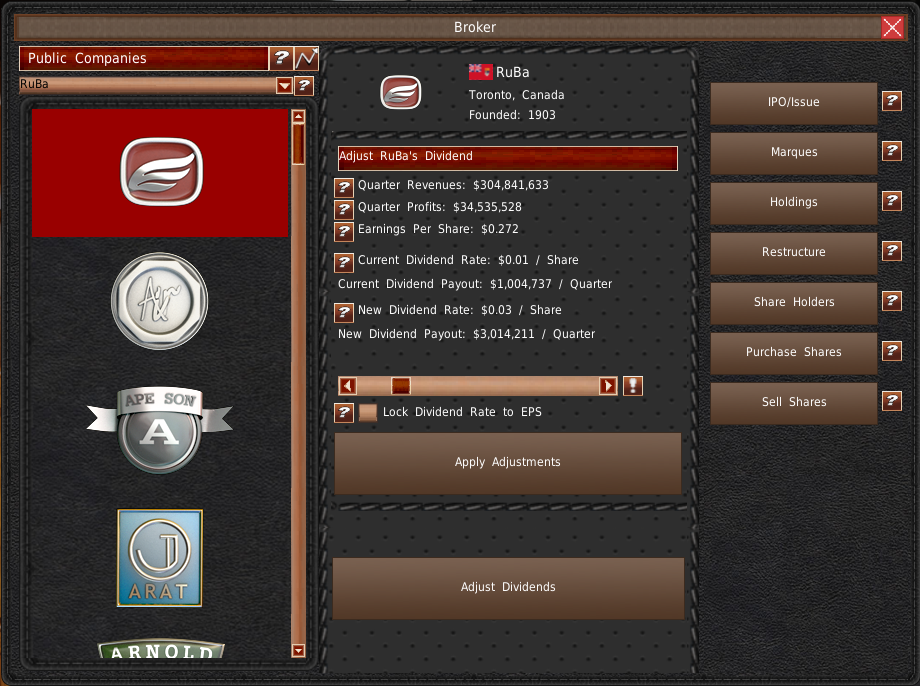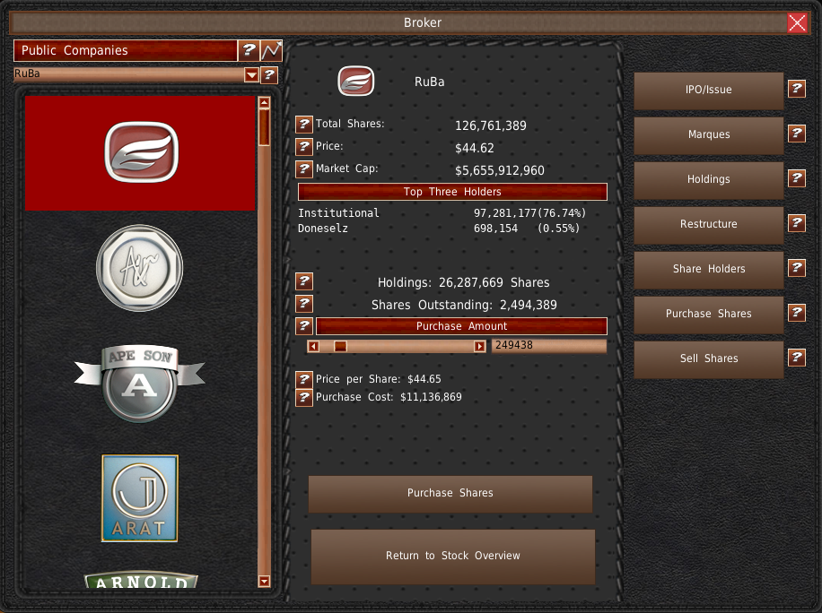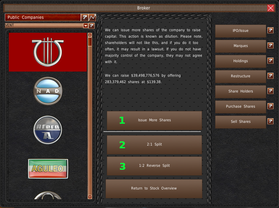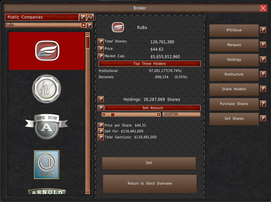 IPOをすると、株式の25%だけが公開販売されます。残りの75%はあなたの所有です。この株式はいつでも売却でき、会社の運営に必要な資金を調達することができます。この株式の売却は、ゲーム内の他の株式の売却と同じように機能します。