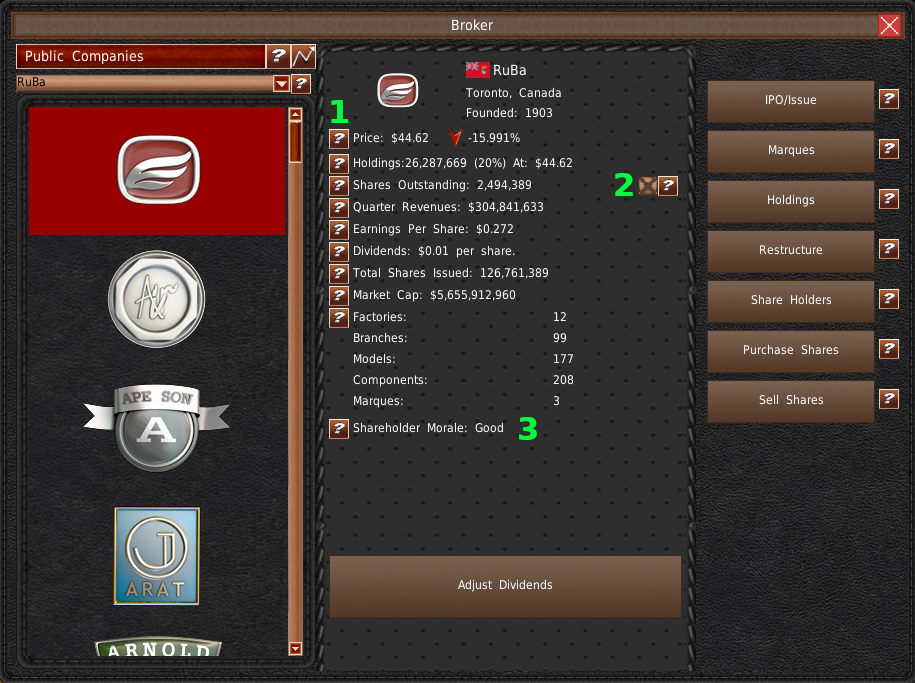 変数の一番下には、株主の士気(#3)があります。この変数は、あなたが経営する会社が選択された場合のみ表示されます。株主の士気は、株主と取締役会があなたのリーダーシップをどう見ているかを示しています。もし彼らの士気が低くなれば、彼らはあなたの意見を聞くことなく、あなたの会社の行動を強制することができます。また、「解雇される可能性」設定が有効な場合、彼らはあなたを解雇し、ゲームオーバーにすることができます。株主を喜ばせるためには、良い業績を出して株価を伸ばすことです。また、配当金を増やすことも喜ばせる方法の一つです。