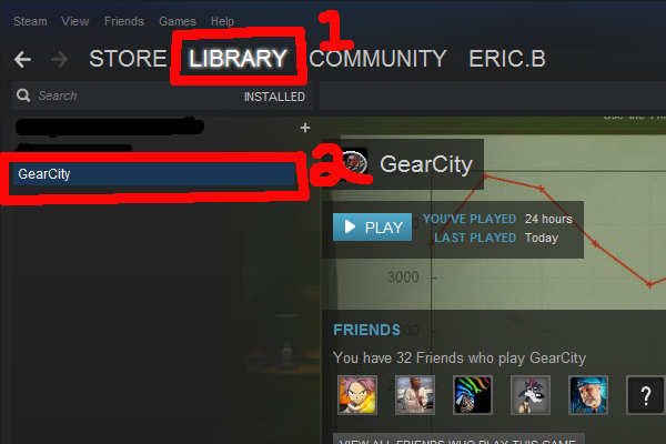 - 左のリストで、「GearCity」を選択します。(ゲームのインストールが必要です) Click for Step 2 image.